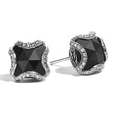 John Hardy Classic Chain Square Stud Earrings w/ Black chalcedony & Diamonds