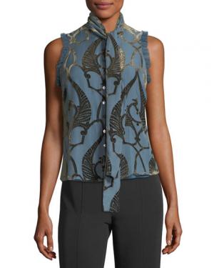 cinq a sept Tie-Neck Button-Front Burnout Velvet Top