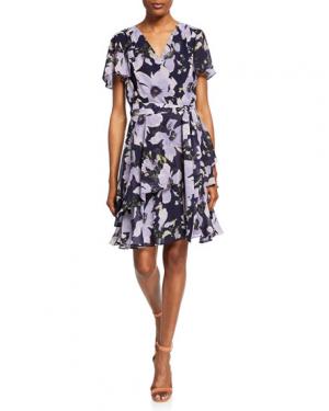 Tahari ASL Floral-Print Ruffle Illusion-Wrap Dress