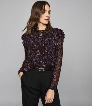 Faiza Black Floral Printed Ruffle Neck Blouse – REISS