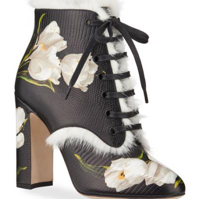 Dolce & Gabbana Floral-Print Leather Fur Lace-Up Booties