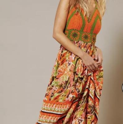 Crinkle Rayon Border Print Crochet Top Maxi Dress