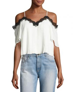 Alice + Olivia Fefe Cold-Shoulder Lace-Trim Pleated Blouse, White/Black