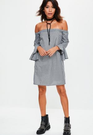 Black Gingham Bardot Frill Sleeve Shift Dress - Missguided
