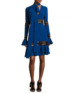 Elie Saab Long-Sleeve Lace-Inset Cocktail Dress with Necktie, Pansy