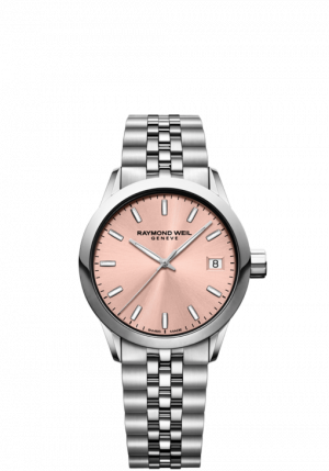 Ladies 34mm Rose Pink Steel Date Watch - Freelancer RAYMOND WEIL