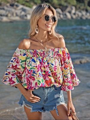 SHEIN VCAY Allover Print Shirred Off Shoulder Blouse