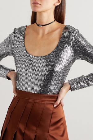 Silver Patent leather-trimmed sequined stretch-jersey bodysuit Gucci
